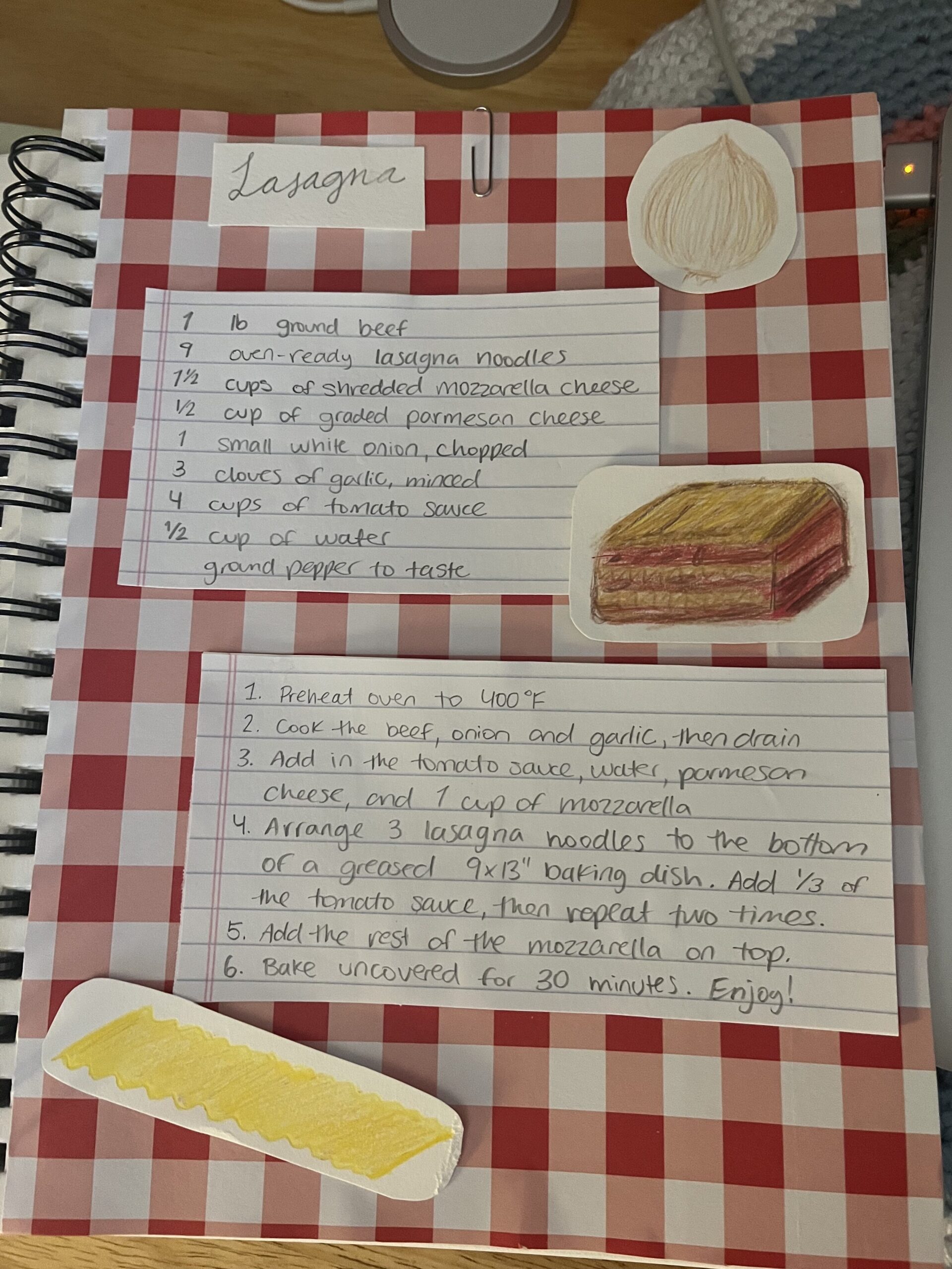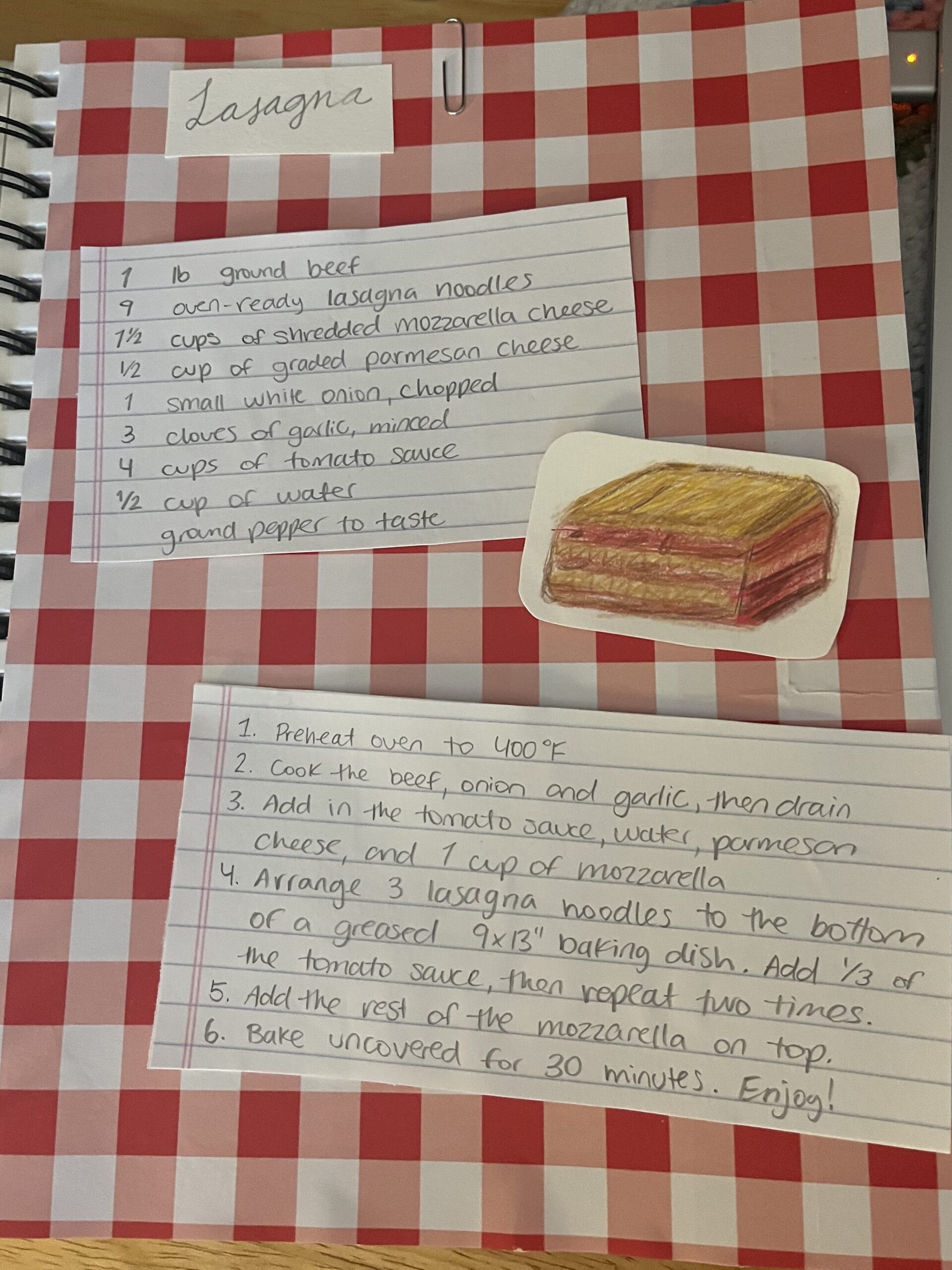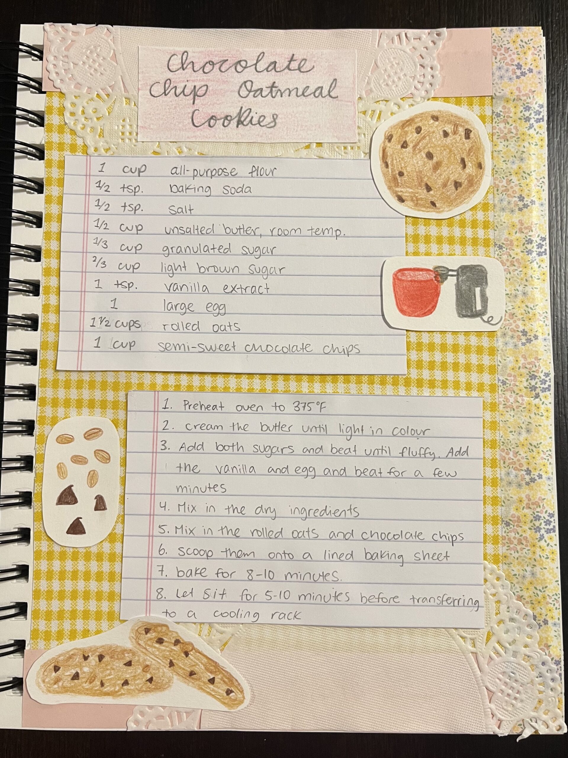 After I cut out the plates, I cut some pieces of lined paper to fit, then wrote out my instructions and ingredients. The next step was to make a title card. I took another flip through the cookbook and found a pattern that I liked and I thought matched the other colours on the page. I cut a small piece out and glued my recipe title to it.