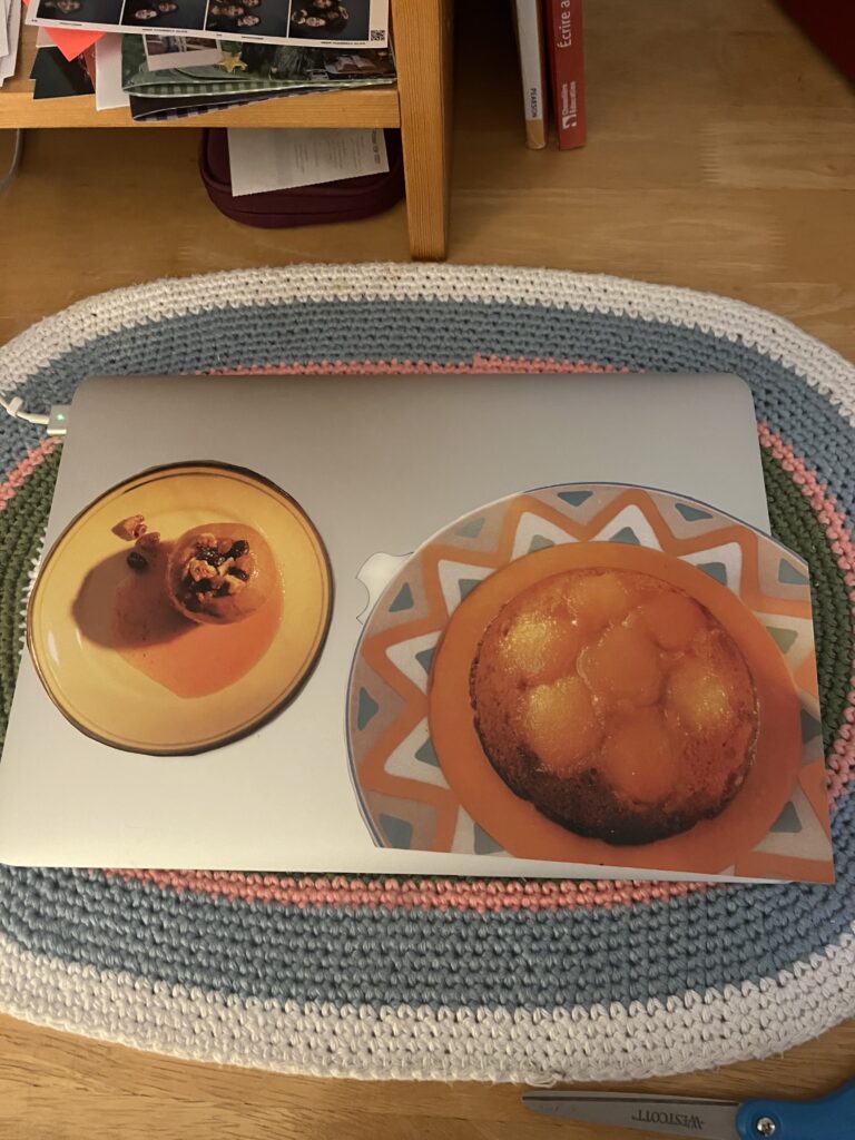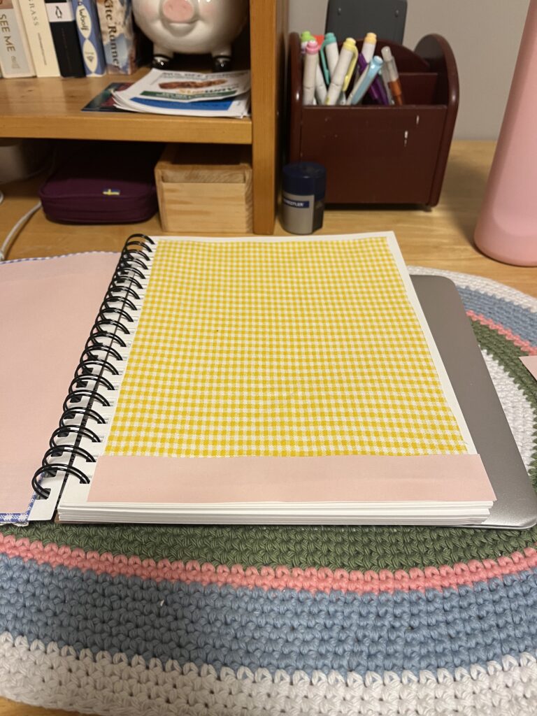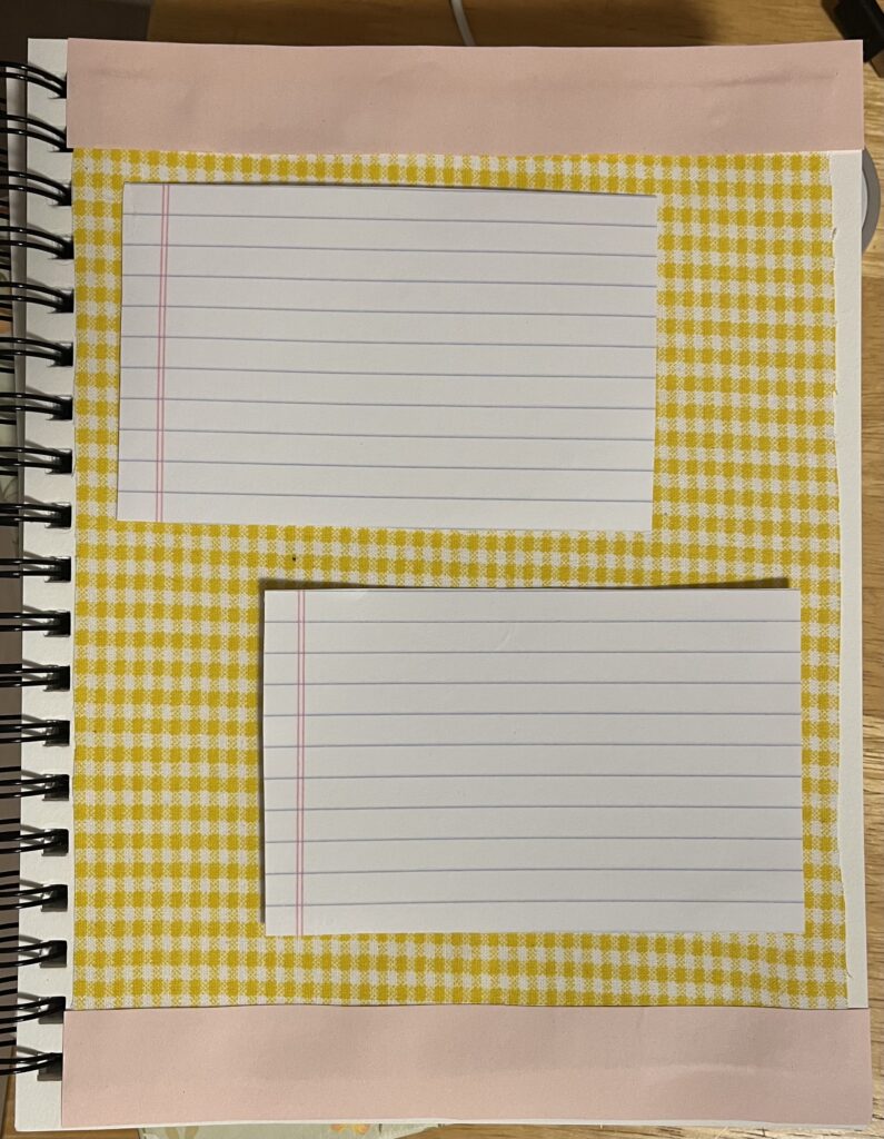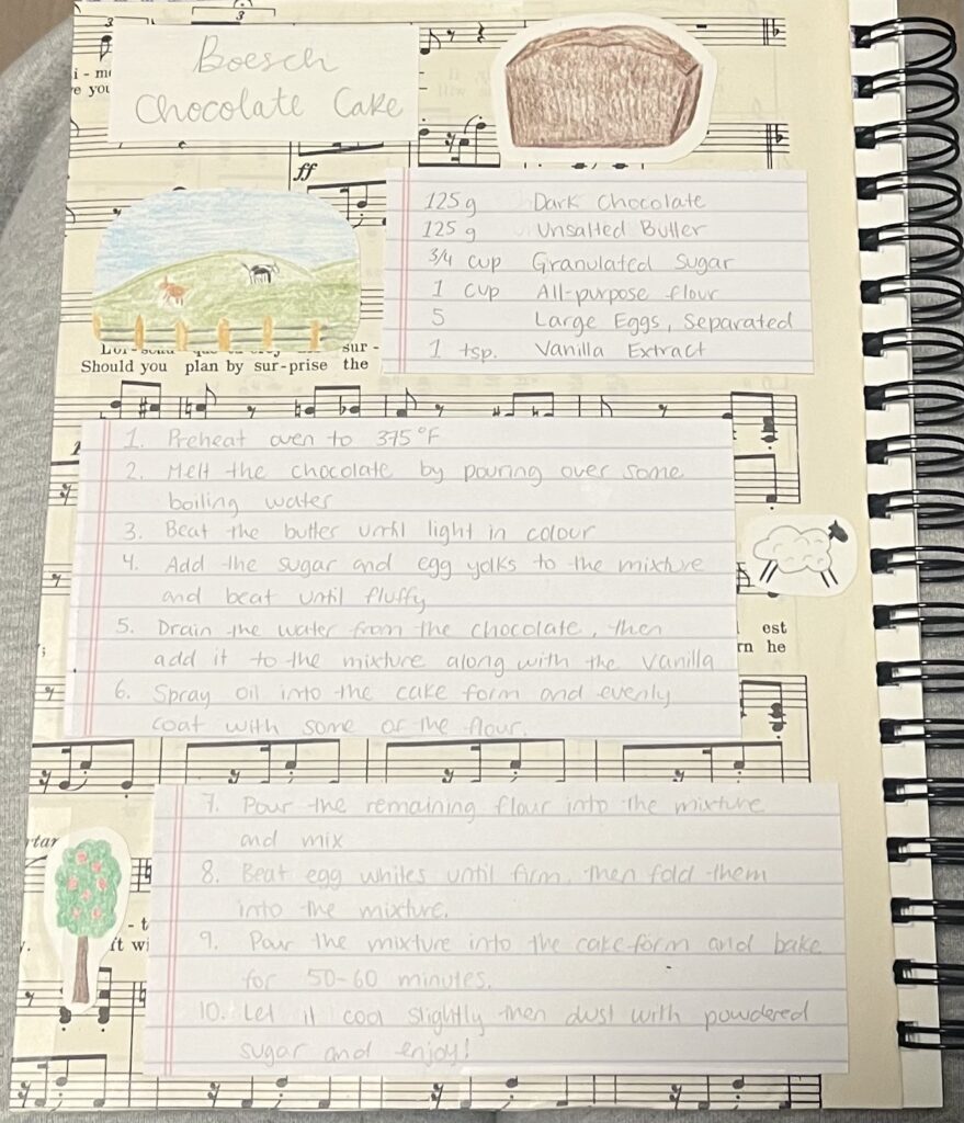 After I cut out the plates, I cut some pieces of lined paper to fit, then wrote out my instructions and ingredients. The next step was to make a title card. I took another flip through the cookbook and found a pattern that I liked and I thought matched the other colours on the page. I cut a small piece out and glued my recipe title to it.
