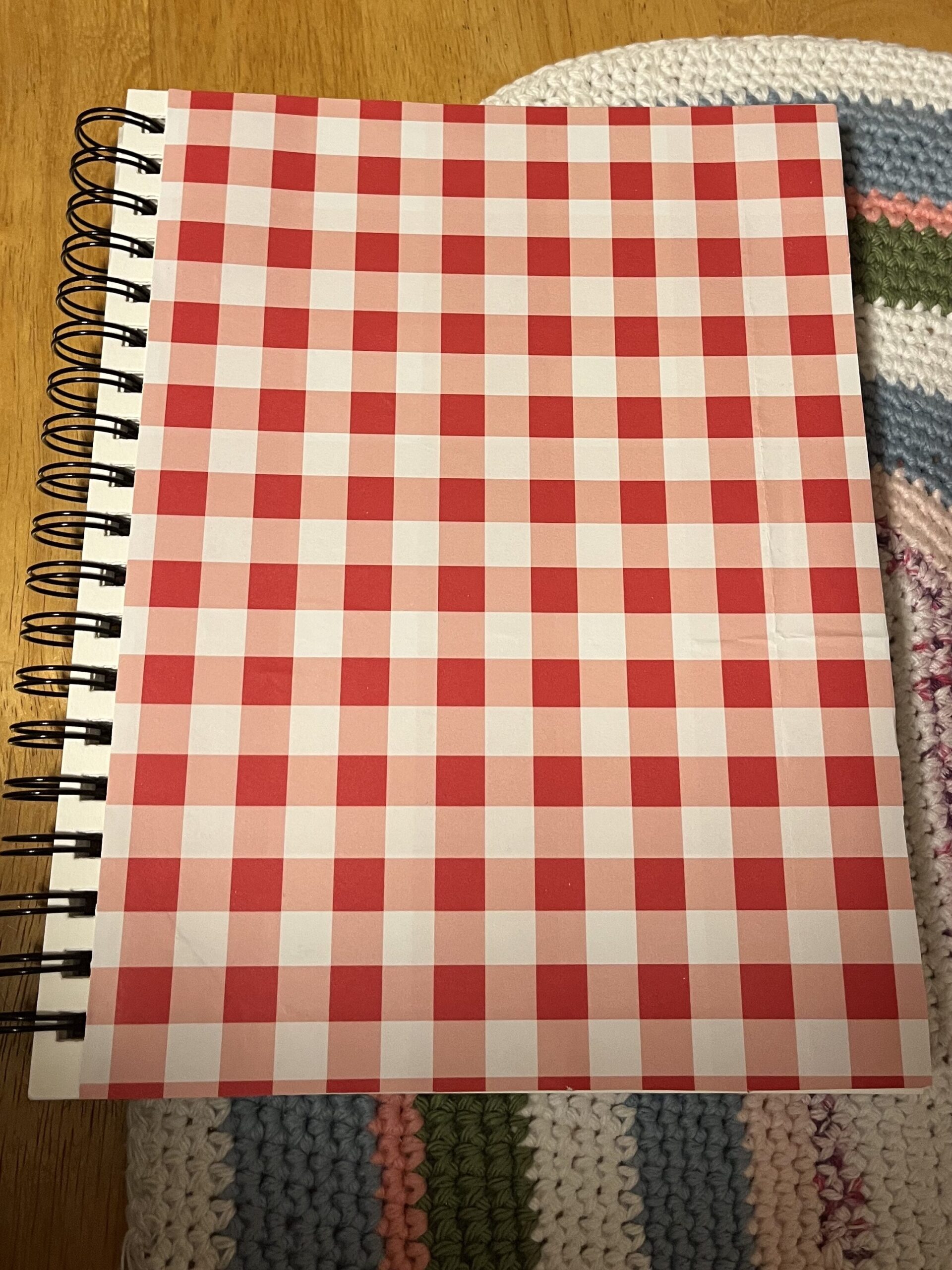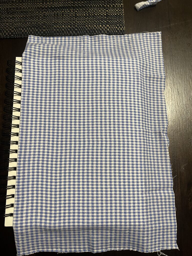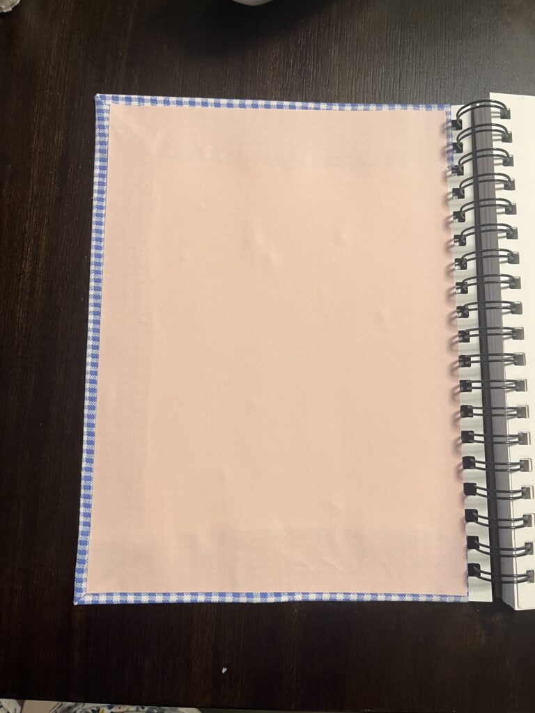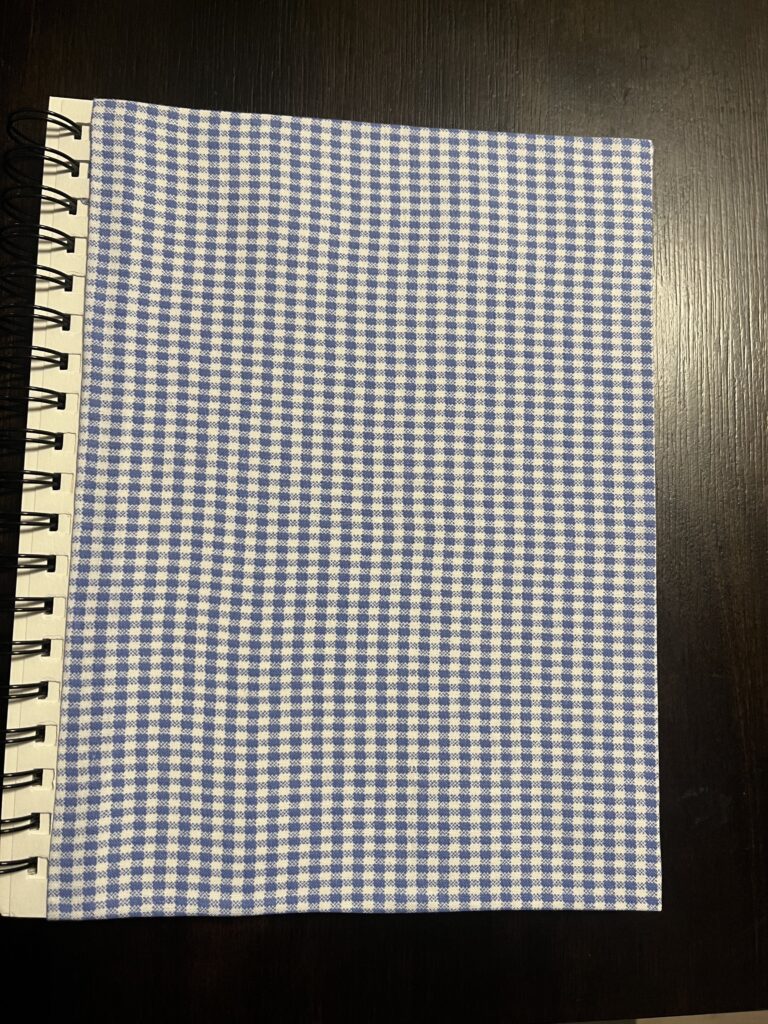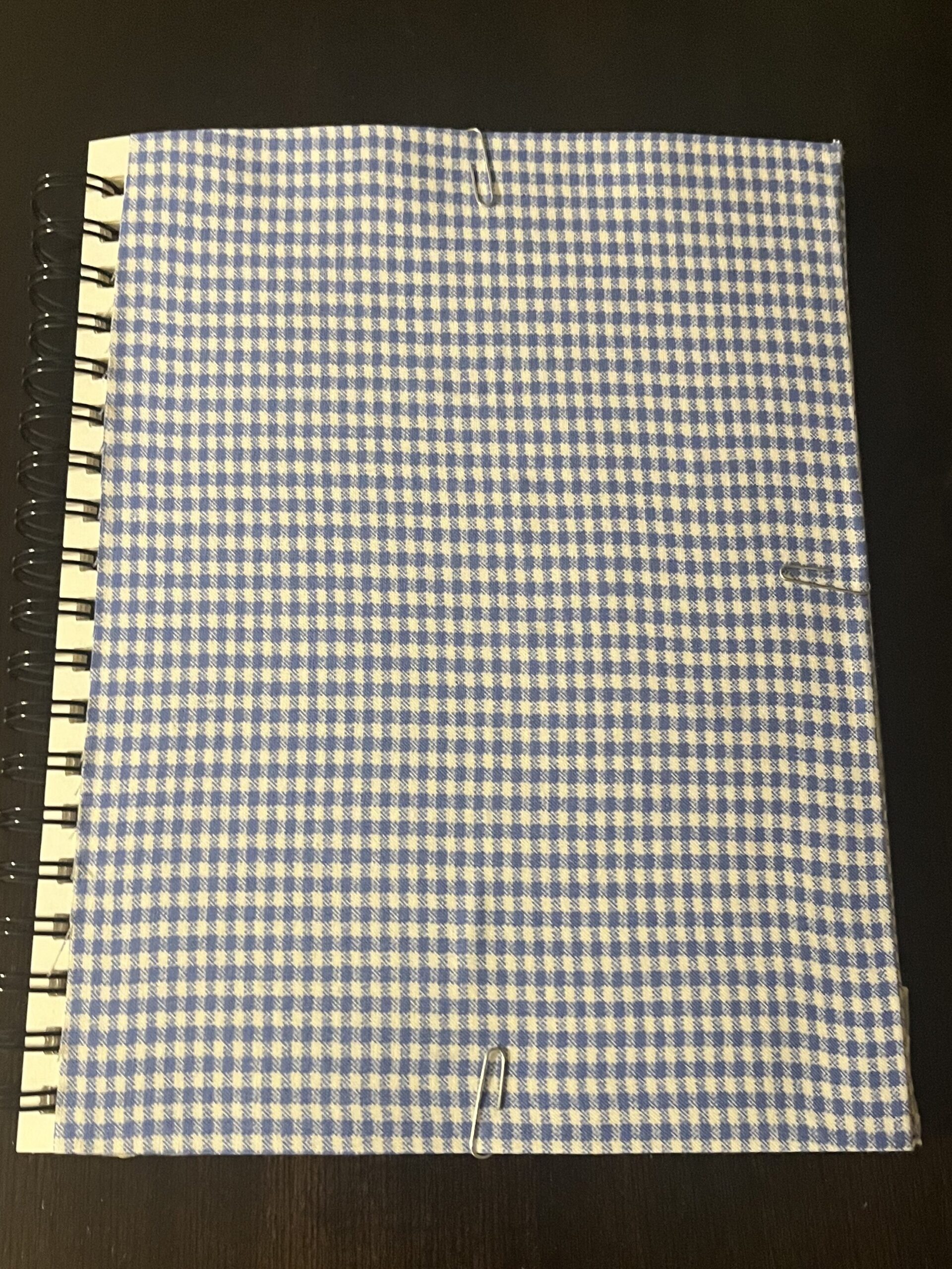 I started the page with my usual process: to pick a background material. This time I picked blue gingham, the same as for the cover page. I chose it becase I wanted something blue for blueberries. For the next parts, I wanted to try something different than for my previous pages to mix things up. When I was first preparing my materials for this project, I bought an old cookbook from the thrift store that has lots of cool culinary pictures and beautiful patterns. My new idea was to cut out some of the patterned plates from the staged pictures and write out my ingredients and instructions on them.