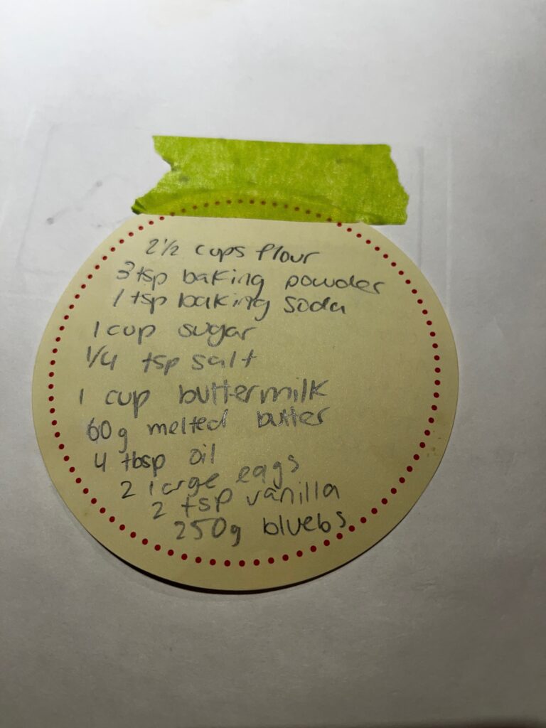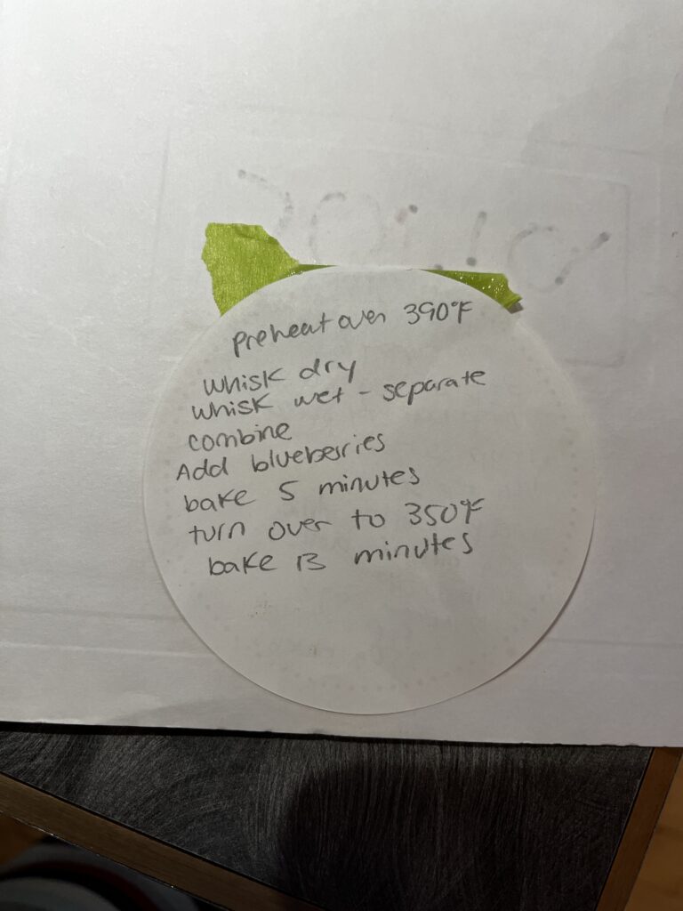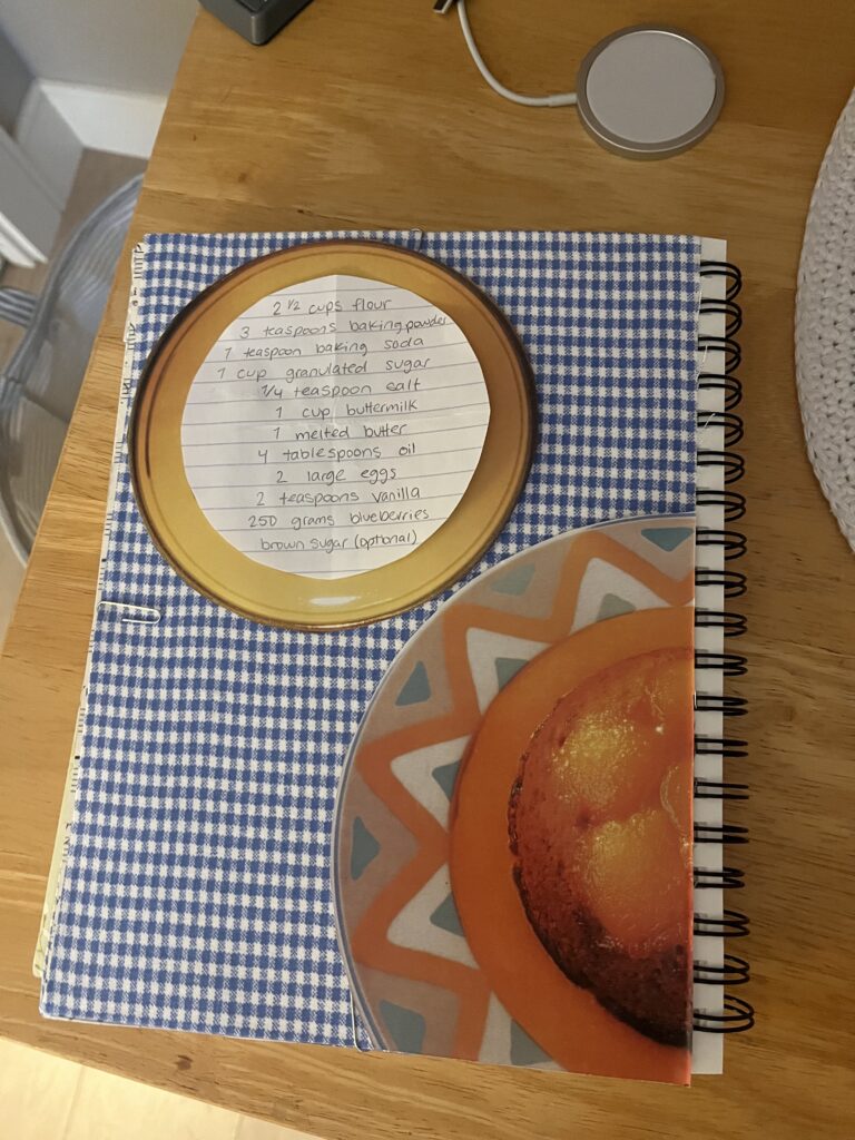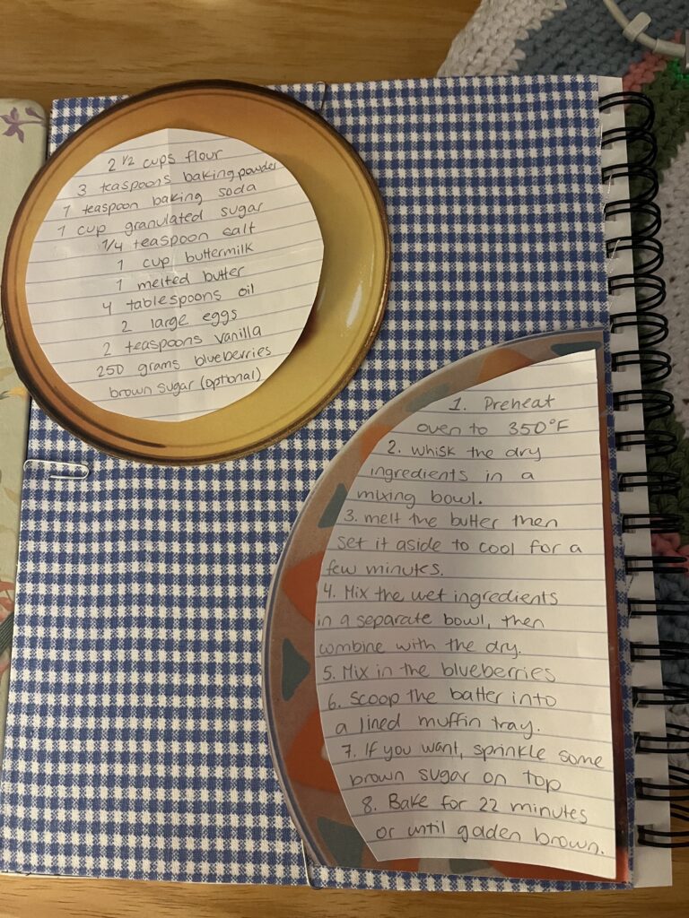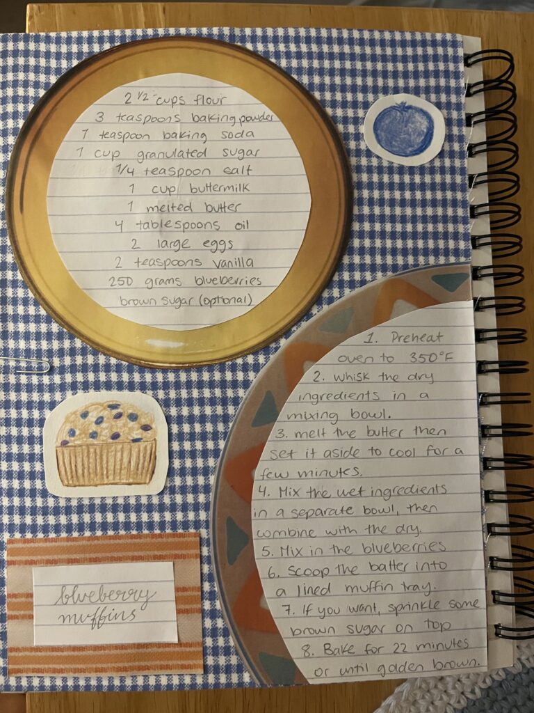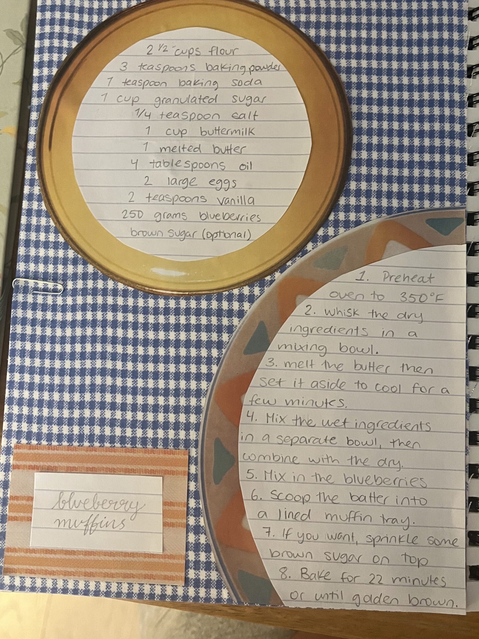 This week I worked on the page for my blueberry muffin recipe! It’s been a while since I made them, but once I took them out of the oven, I was reminded of how much I love them! They are light, fluffy, and not too sweet, with the bonus of incorporating fresh berries! After learning my lesson with the chocolate chip cookies, I made sure to pay extra attention to the labels on my measuring spoons. I also made sure to bake the muffins before writing out the instructions and ingredients to pay attention to the unwritten things I do when I bake.